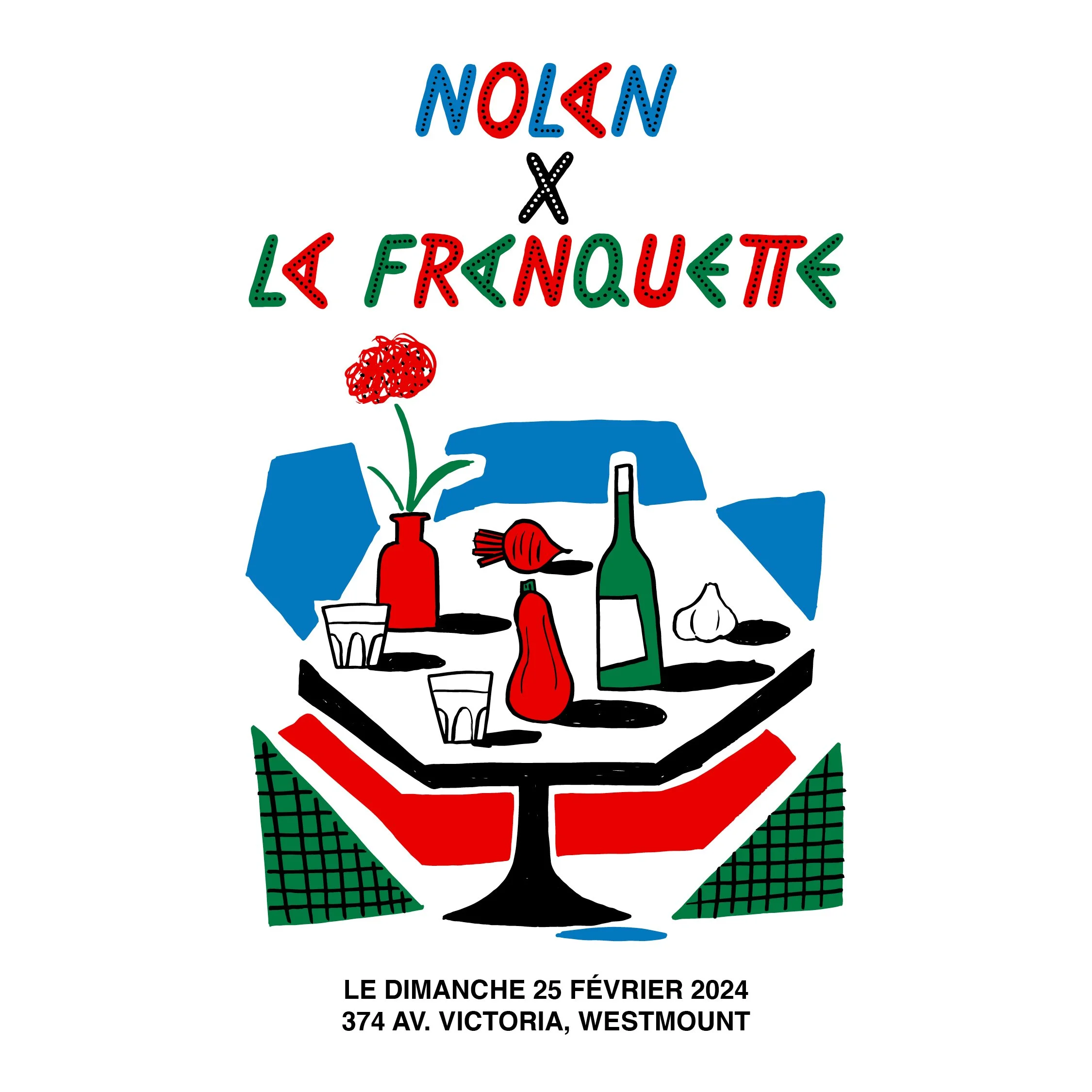 Affiche pour un événement gastronomique conjoint des restaurants Nolan et La Franquette dans le cadre du festival Montréal en Lumière 2024.